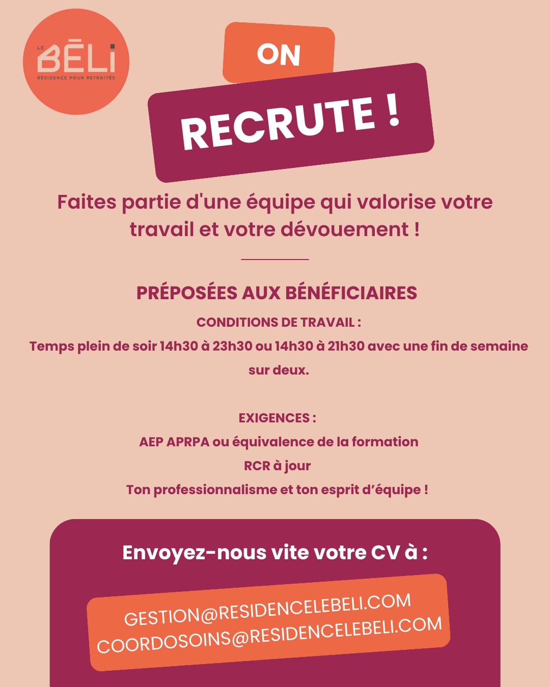 La résidence Le Béli offre un environnement de travail inspirant et enrichissant basé sur le travail d'équipe et l'épanouissement de chacun de ses employés. Le Béli évoluant dans un secteur en constante évolution, offre à ses employés un milieu de travail donnant envie de se dépasser à tous les jours. Vous souhaitez un emploi tourné vers l'être humain et basé sur le bien-être de nos aînées, venez découvrir les opportunités d'emplois.